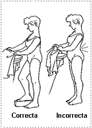 Para una correcta posición en bipedestaciónes preciso evitar la hiperlordosis lumbar, adaptando una inadecuada posición de pelvis, y mantener el dorso erecto.